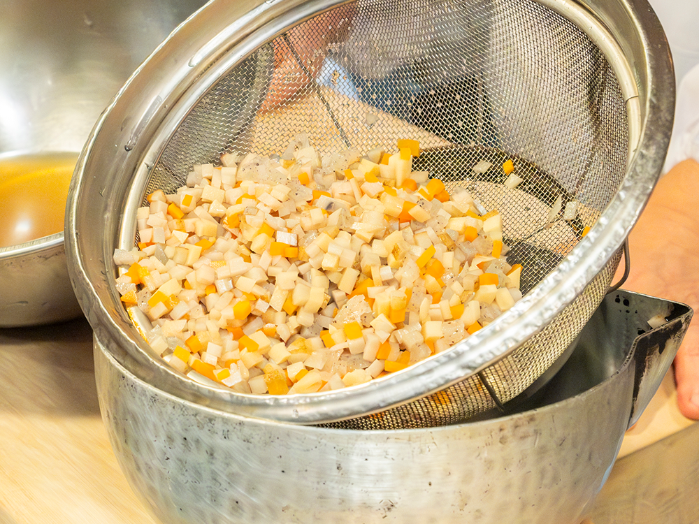 ☆の材料はサイの目に切り、薄口醤油を加えた出汁で炊く。
